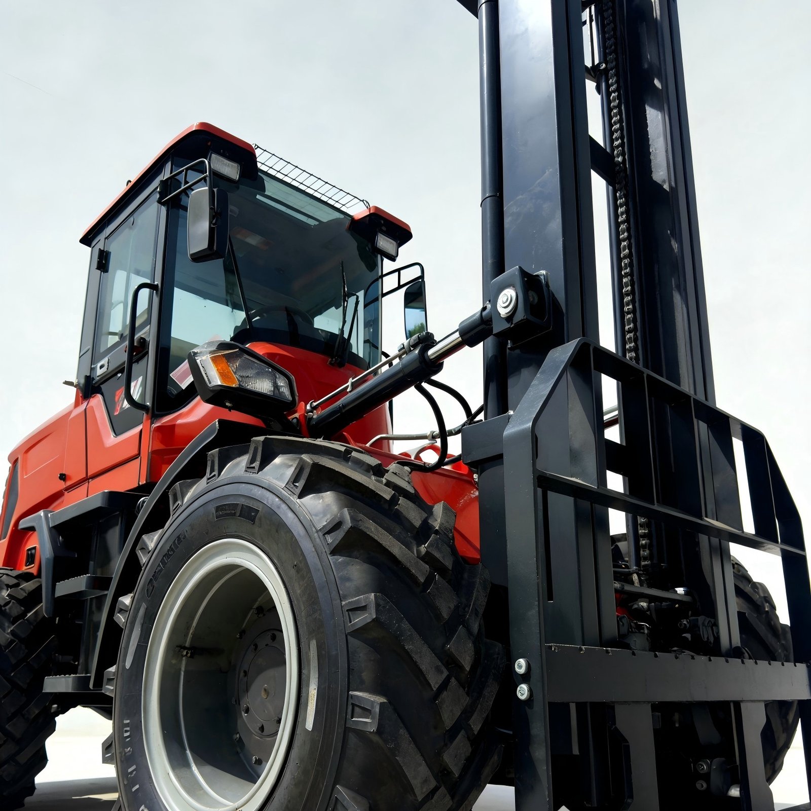 The Pande articulated off-road forklift is designed for heavy-duty handling and traversing harsh terrain, combining the robust structure of a loader chassis with the efficient handling capabilities of a traditional forklift. The entire vehicle utilizes a thickened loader chassis, equipped with a high-power diesel engine, a four-wheel drive system, and heavy-duty off-road tires, boasting excellent off-road performance and high traction, adapting to complex conditions such as mud, gravel, and slopes. The front-wheel steering structure is stable and reliable, providing enhanced handling and making it suitable for medium- to long-distance transport and traversing multi-obstacle terrain. Equipped with a high-position air intake, dustproof cooling system, and multi-functional hydraulic control platform, it ensures stable and efficient operation even under high-temperature, high-dust, and other high-intensity working environments. It is widely used in mining areas, construction sites, forest areas, and other work sites with extremely high requirements for equipment reliability and off-road performance.